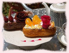 2)エクレア 花材費:¥4200 ![]() プレーンとチョコエクレアの2個と 白いコンポートにソースでデコレーションします。 |