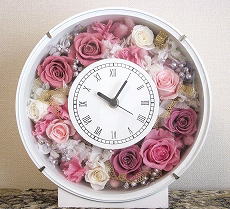 108)フラワークロック(オリジナル) 花材・資材費 ¥8500 希望の色の花を贅沢に使った花時計。置き時計としても壁掛けとしても使えて便利。宿題ありのカリキュラムですので、2回前のレッスンでご予約ください。 |