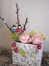 107)早春ネコヤナギ(オリジナル) 花材・資材費 ¥3100 プリザーブドのネコヤナギを使用。女の子のためのひなまつりに合わせ、ポップなキャンディーボールをつなげました。 |