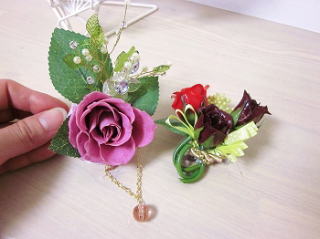 110)ダブルコサージュ(オリジナル) 花材・資材費 \2800 コサージュは使わないときにしまっているばかりでもったいない!2つのコサージュをかわいく飾って使いましょう。プリザのローズはお選び下さい。 |