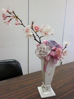 | 111)さくら(オリジナル) 花材・資材費 \3000 ※完売 アートの桜を使った春のアレンジです。ローズの色はご予約時にお選び下さい。 |
