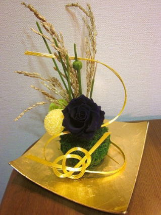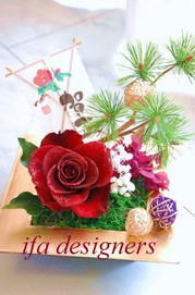101)ダイヤモンドローズの和風花(IFA) ダイヤモンドローズを使った豪華なアレンジです。水引にスワロを通して和モダンに仕上げましょう。