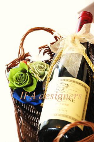 119)父の日ボトルアレンジ(IFA) バスケット、ギフトラッピング(セロファン・ペーパー・カード付き)、スーツの胸元にスワロの『ピンブローチ』を!ギフトにするボトル(ワイン・焼酎・日本酒など)を必ずお持ち下さい!! |