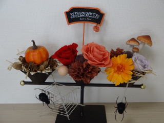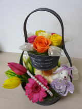 2段のブリキベースにチューリップやローズ、ガーベラとたくさんの花をアレンジしました。 |